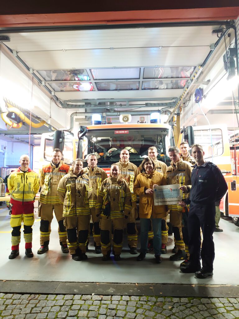 Wie jedes Jahr beteiligt sich auch die Feuerwache am lebendigen Adventskalender. Im Rahmen der Aktion am 9.12.2025 nahm Maria Icking vom Lenkungskreis des Netzes den Scheck vom kommisarischen Leiter der Wache Christoph Gaillard entgegen.